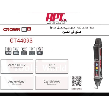 “مفك كاشف جهد كهربائي كراون CT44093 —نطاق الجهد المكتشف (AC): من 24 إلى 1000 فولت يكشف وجود التيار بدون اتصال مباشرنطاق الجهد المكتشف (AC): من 24 إلى 1000 فولت، بفضل تنبيه LED، صوت واهتزاز. مزوَّد بكشاف مدمج وتصميم مدمج للمهنيين