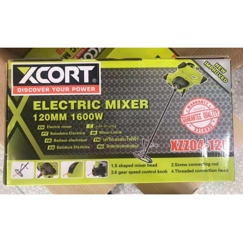 خلاط بوياه/مونة/خرسانة كهربائي Xcort 1600 وات موديل XZZ04-120 بقطر ريشة 120 مم وسرعة حتى 800 لفة/دقيقة. مناسب لموقع البناء والورش، يعمل على جهد 220-240 فولت.